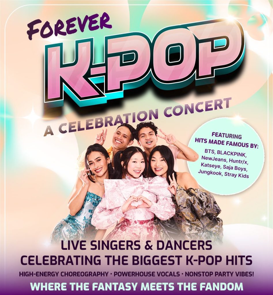 Designed as a high-energy K-pop revue, Forever K-Pop – A Celebration Concert fuses electrifying vocals and choreography, bold costuming, and cinematic visuals into a dazzling live performance. Presented in two exhilarating 45-minute acts, the show captures the pulse of the global K-pop movement while spotlighting iconic moments and breakout anthems including electrifying live singers and dancers performing songs made famous by BTS, BLACKPINK, Katseye, HUNTR/x, Saja Boys, NewJeans, and more.